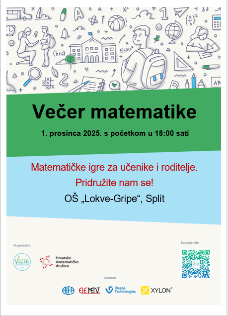 ovogodišnja Večer matematike u OŠ “Lokve-Gripe” održat će se u ponedjeljak, 1. prosinca 2025.godine s početkom u 18:00 sati za učenike viših razreda. Učiteljice razredne nastave organizirat će ovo događanje u terminu prema dogovoru sa svojim razredima.